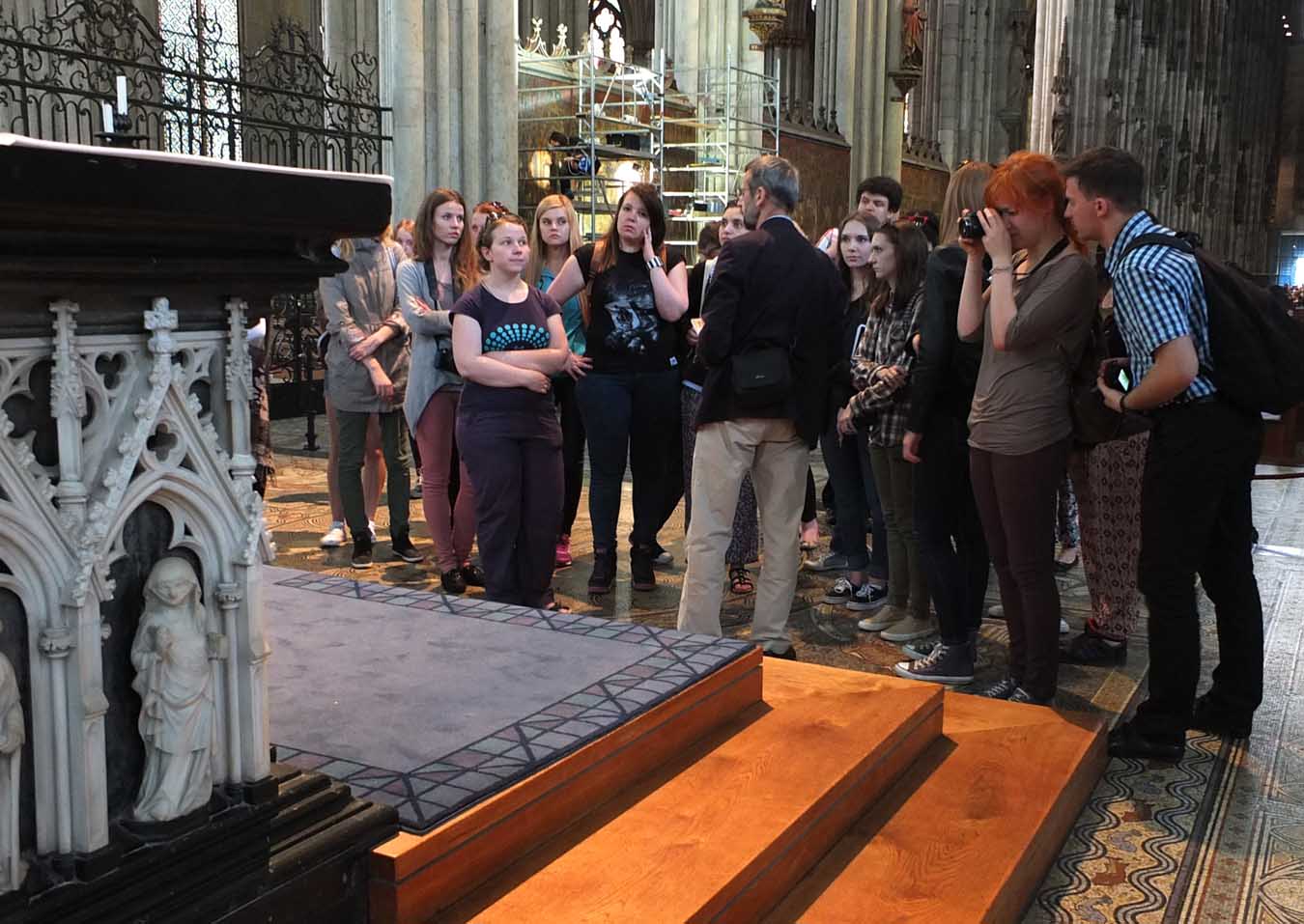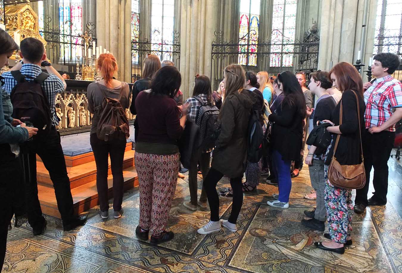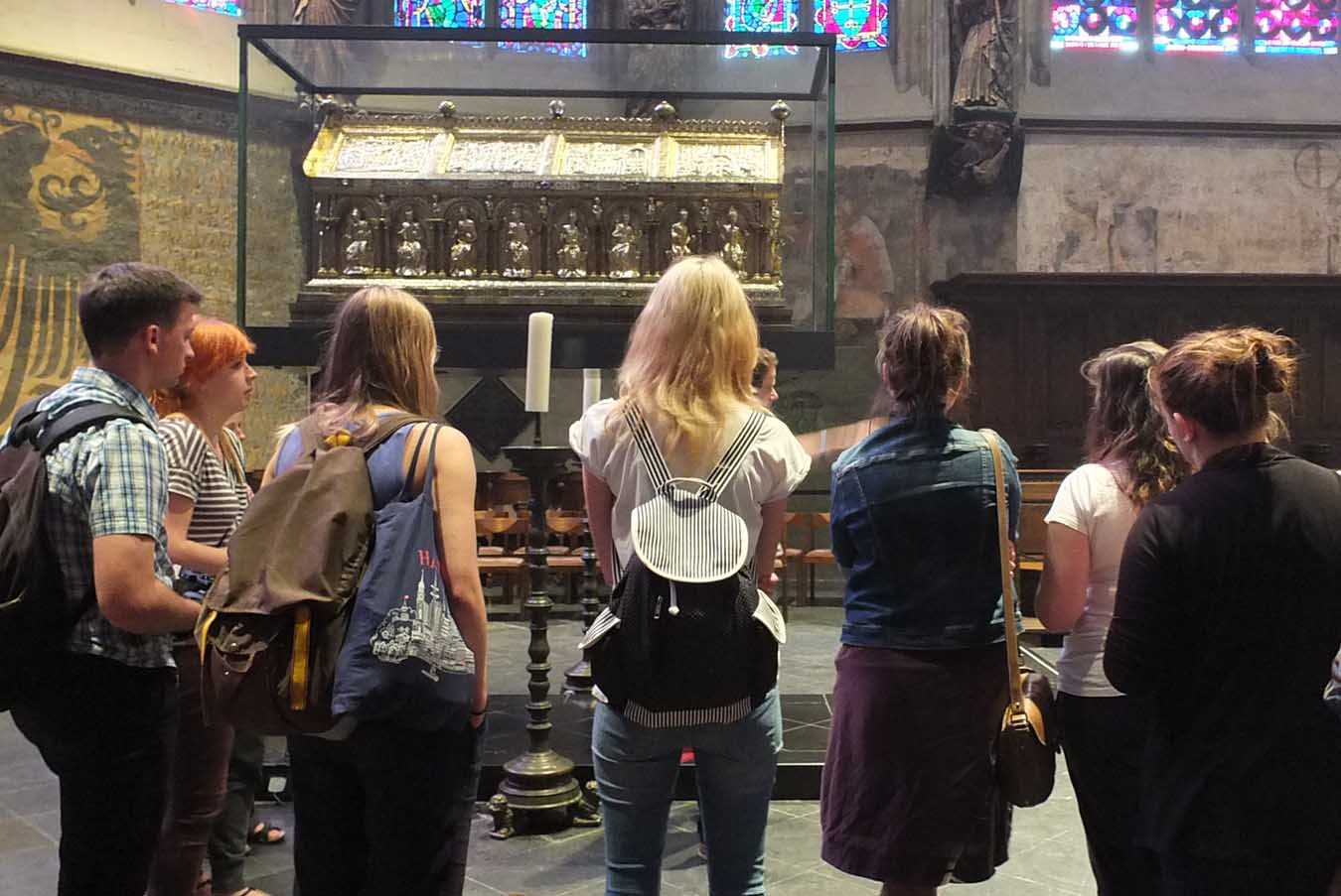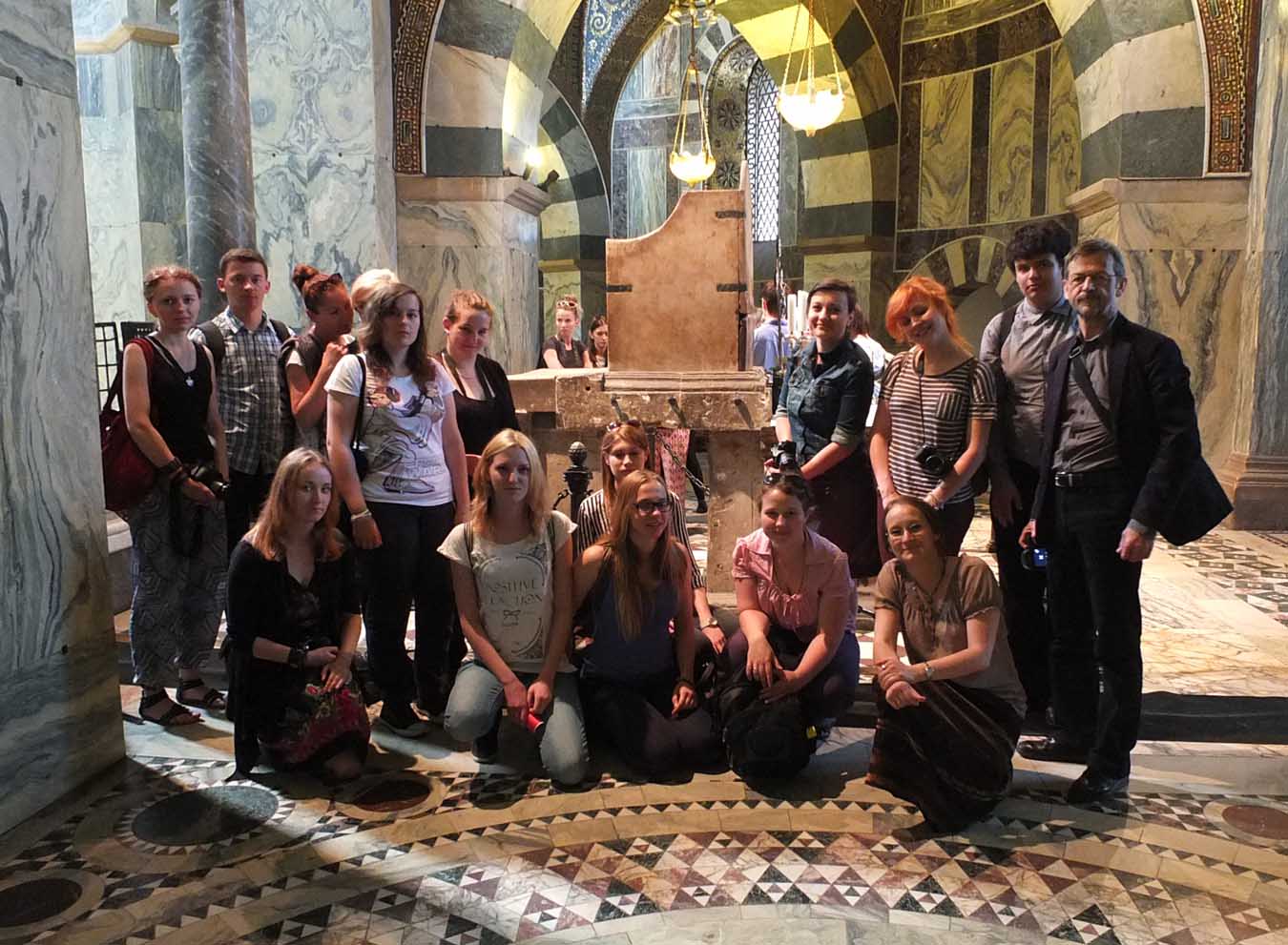 Zajęcia na terenie kompleksu katedralnego w Aachen wprowadziły uczestników w szeroki kontekst historyczno-kulturowy dawnej Nadrenii. Katedra w Aachen – na Liście Światowego Dziedzictwa UNESCO od 1978 – to przykład bezcennego zabytku kultury, kumulującego w sobie cały szereg istotnych wartości, ponadto – stanowi też świetne exemplum przemian ideowych, funkcjonalnych, architektonicznych oraz historycznych nawarstwień. Studenci mieli też okazję wejścia na emporę kaplicy pałacowej. Osobnym punktem harmonogramu było zwiedzanie wystawy czasowej Karl der Grosse – Macht, Kunst, Schaetze, w Domschatzkammer, Centre Charlemagne oraz ratuszu akwizgrańskim.