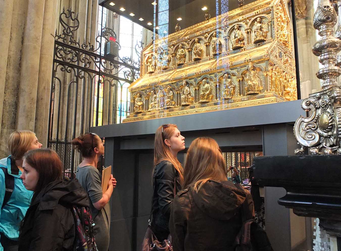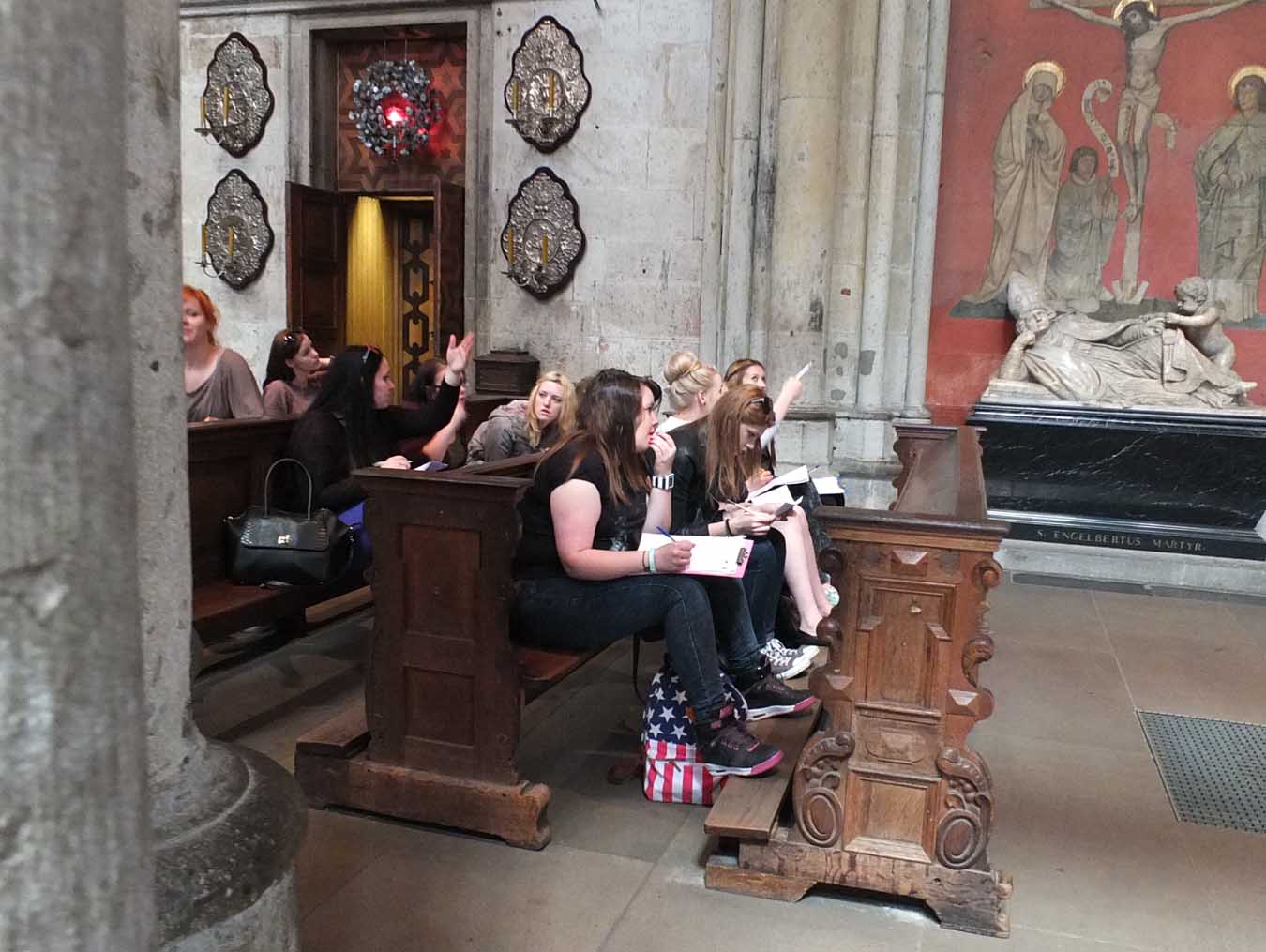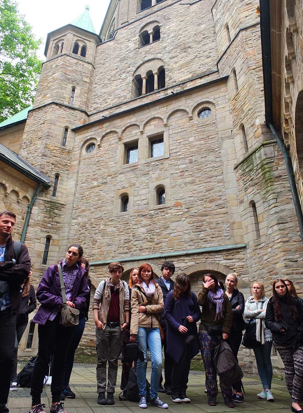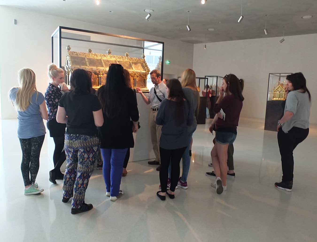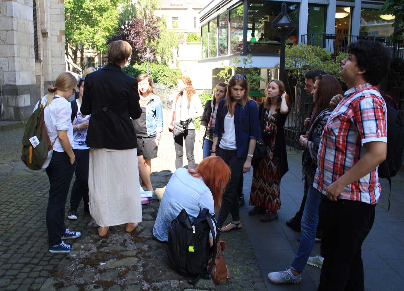Zajęcia na terenie kompleksu katedralnego w Aachen wprowadziły uczestników w szeroki kontekst historyczno-kulturowy dawnej Nadrenii. Katedra w Aachen – na Liście Światowego Dziedzictwa UNESCO od 1978 – to przykład bezcennego zabytku kultury, kumulującego w sobie cały szereg istotnych wartości, ponadto – stanowi też świetne exemplum przemian ideowych, funkcjonalnych, architektonicznych oraz historycznych nawarstwień. Studenci mieli też okazję wejścia na emporę kaplicy pałacowej. Osobnym punktem harmonogramu było zwiedzanie wystawy czasowej Karl der Grosse – Macht, Kunst, Schaetze, w Domschatzkammer, Centre Charlemagne oraz ratuszu akwizgrańskim.