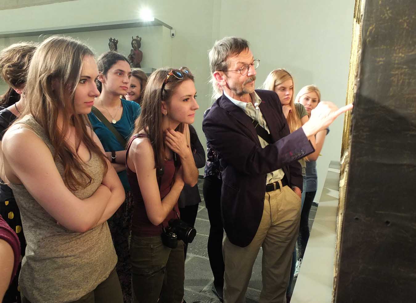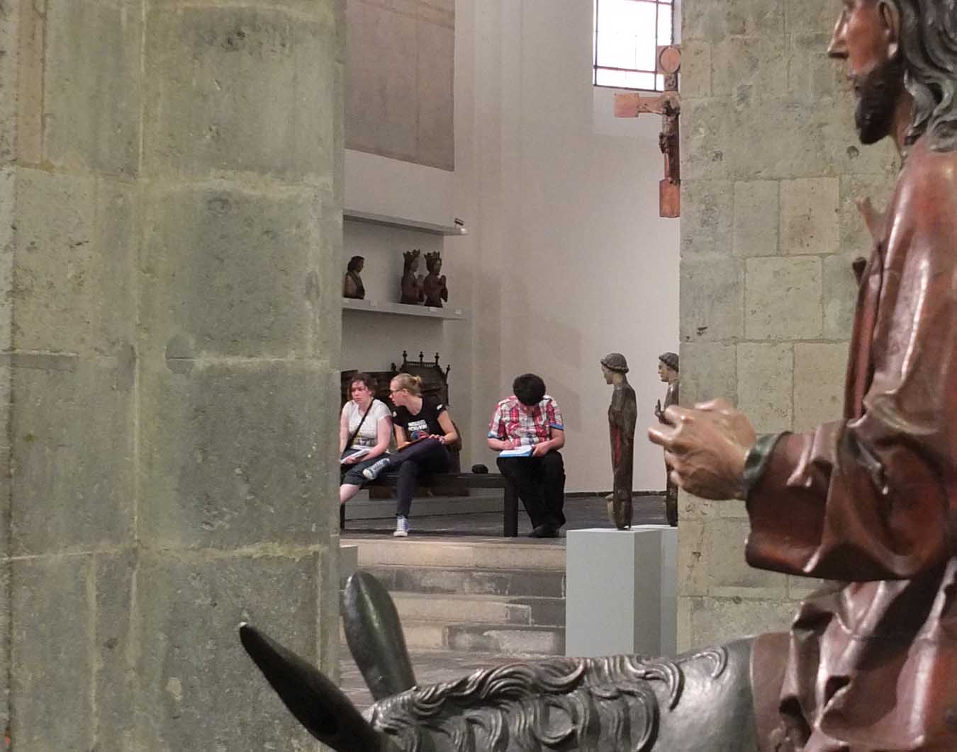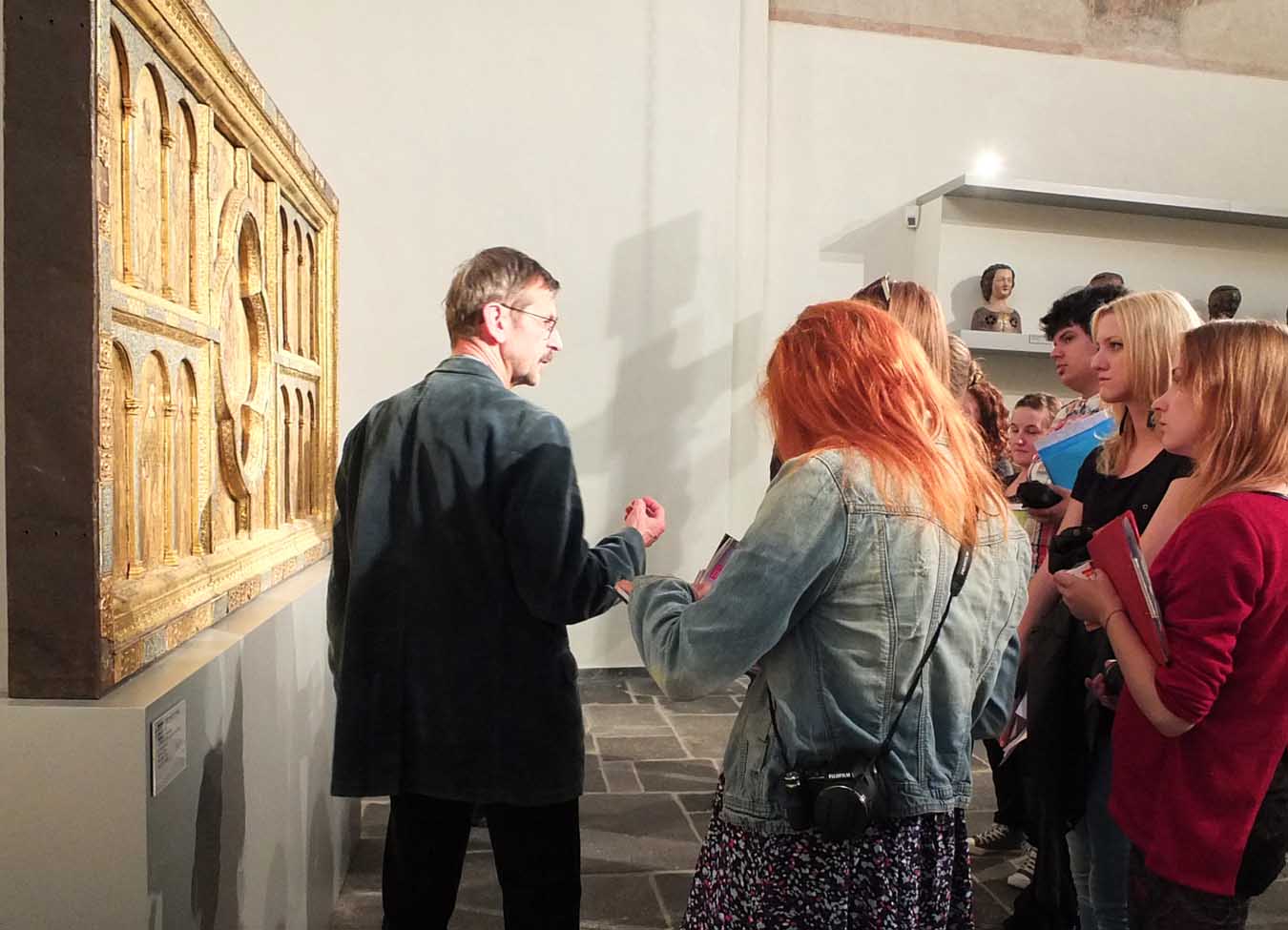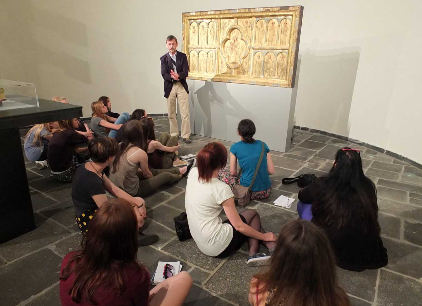 Pierwsza część zajęć, prowadzonych na terenie Kolonii, koncentrowała się wokół katedry i jej problematyki: historycznej, architektonicznej i konserwatorskiej, uczestnicy mieli też okazję wejścia do chóru i zapoznania się ze zgromadzonymi tam zabytkami. Studenci przeprowadzili samodzielną analizę koncepcji wystawienniczej skarbca katedralnego oraz zmierzyli się z problemem funkcjonowania i oddziaływania dzieła sztuki w przestrzeni sakralnej.