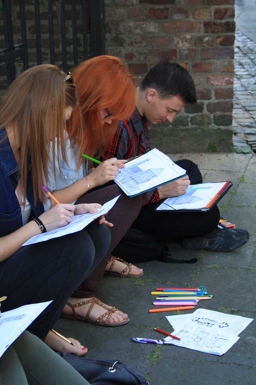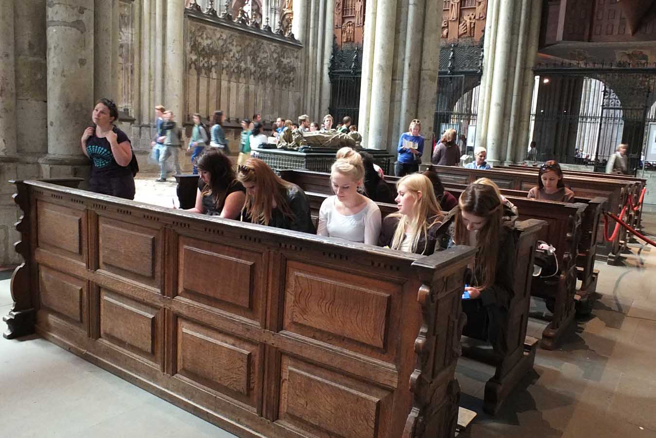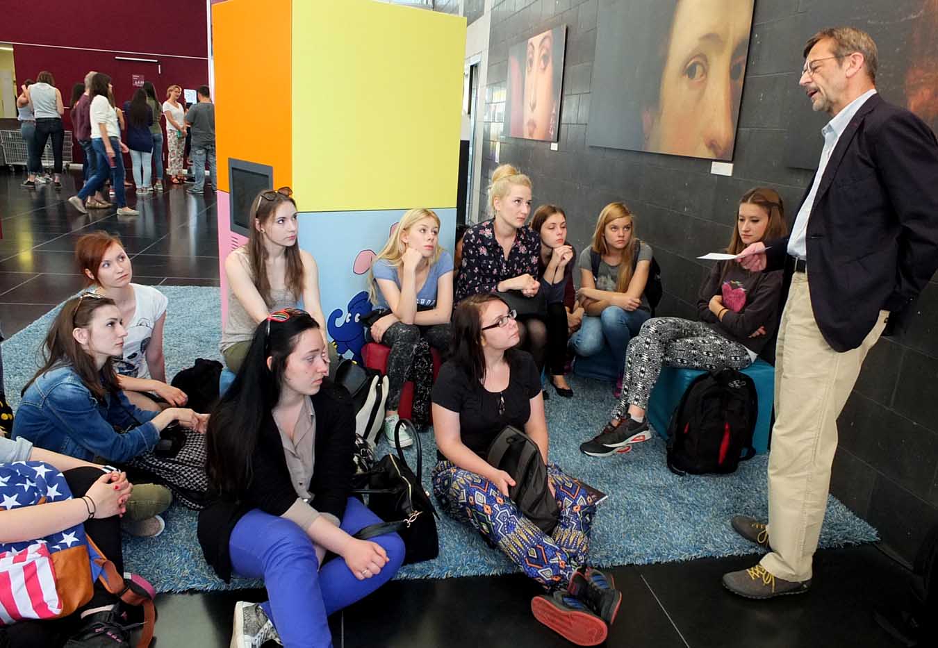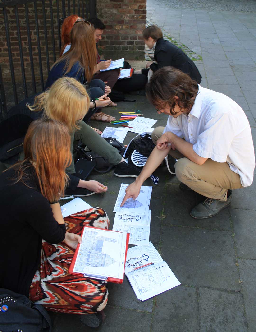 Pierwsza część zajęć, prowadzonych na terenie Kolonii, koncentrowała się wokół katedry i jej problematyki: historycznej, architektonicznej i konserwatorskiej, uczestnicy mieli też okazję wejścia do chóru i zapoznania się ze zgromadzonymi tam zabytkami. Studenci przeprowadzili samodzielną analizę koncepcji wystawienniczej skarbca katedralnego oraz zmierzyli się z problemem funkcjonowania i oddziaływania dzieła sztuki w przestrzeni sakralnej.