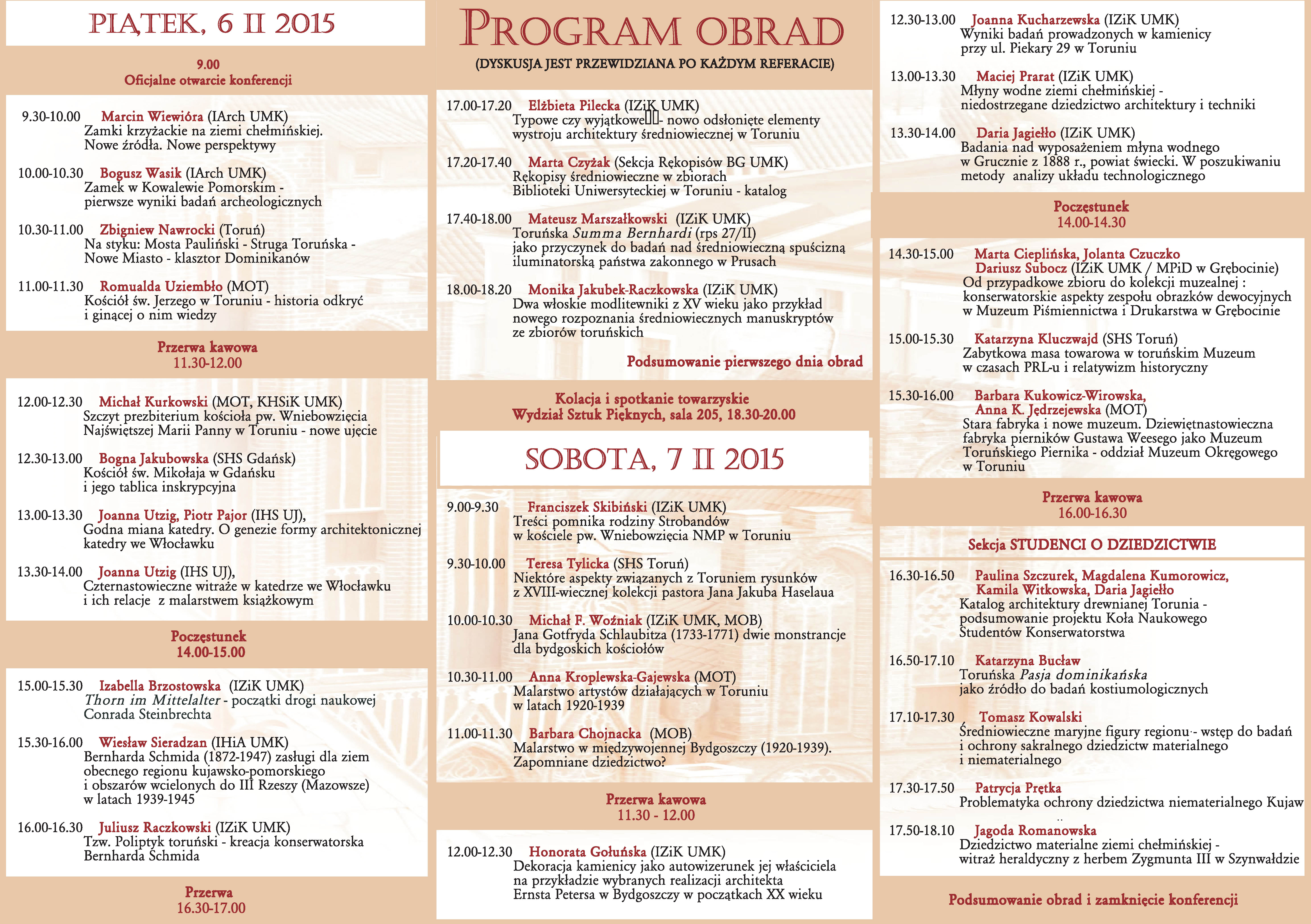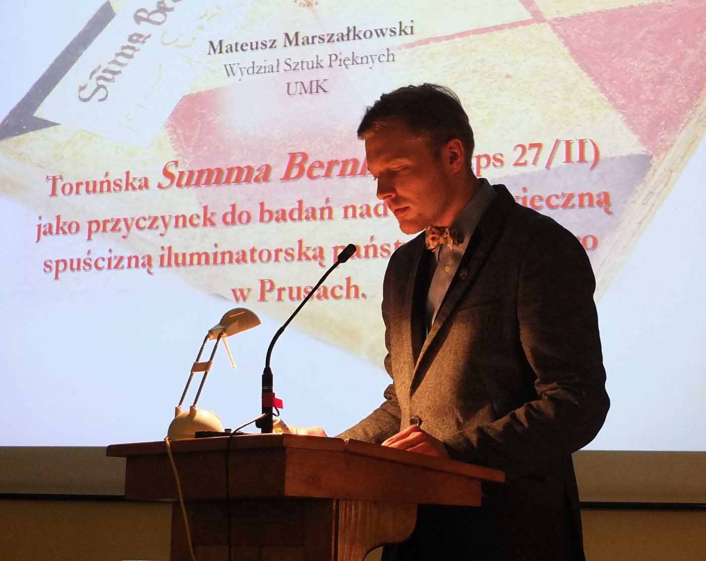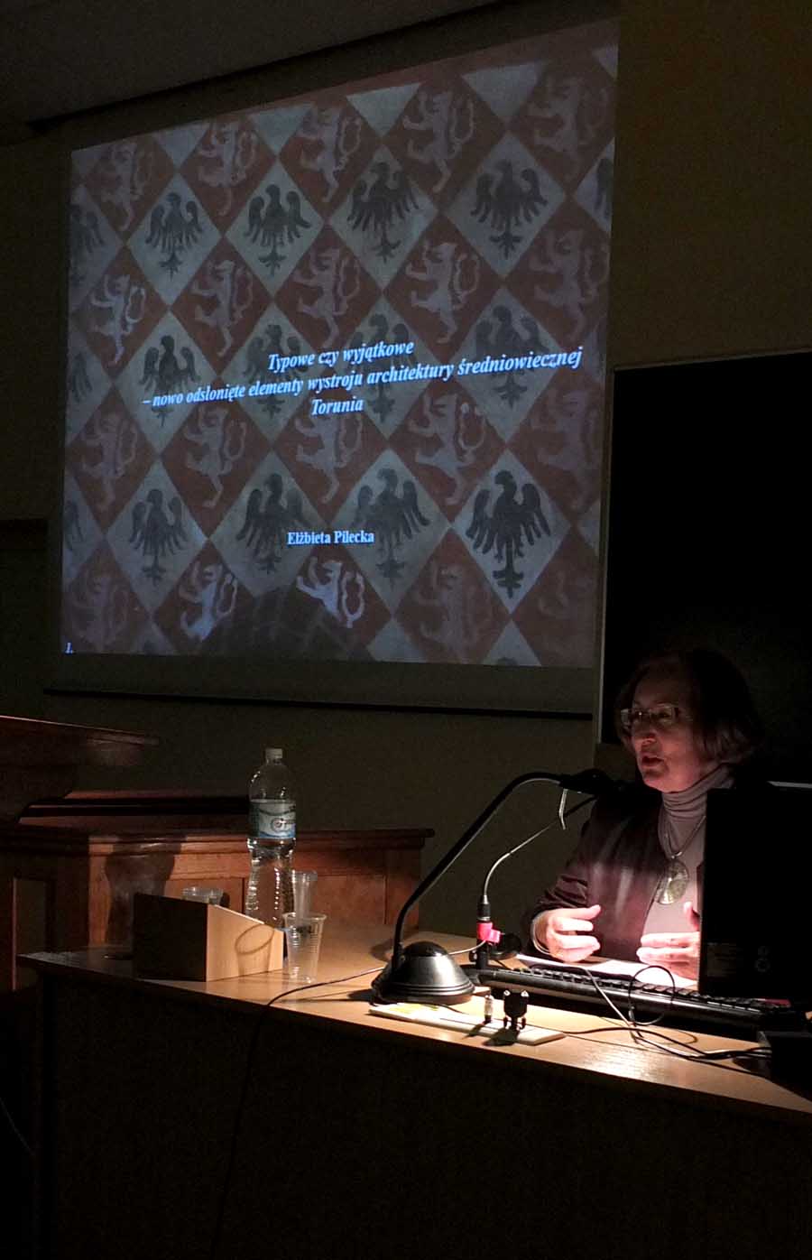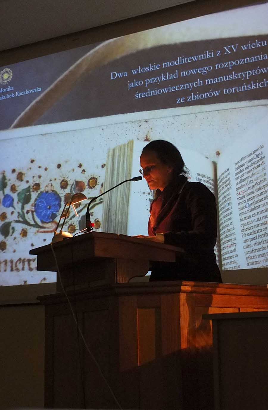 E. Pilecka („Typowe czy wyjątkowe? nowo odsłonięte elementy wystroju architektury średniowiecznej w Toruniu”), M. Jakubek-Raczkowska („Dwa włoskie modlitewniki z XV wieku jako przykład nowego rozpoznania średniowiecznych manuskryptów ze zbiorów toruńskich”), J. Raczkowski („Tzw. poliptyk toruński – kreacja konserwatorska Bernharda Schmida?”), F. Skibiński („Treści pomnika rodziny Strobandów w kościele Wniebowzięcia NMP w Toruniu”), M. Marszałkowski („Toruńska Summa Bernhardi [Rps 27/II] jako przyczynek do badań nad średniowieczną spuścizną iluminatorską państwa zakonnego w Prusach”). W sekcji „Studenci o dziedzictwie” głos zabrali studenci, piszący przy Zakładzie prace magisterskie: K. Bucław („Toruńska pasja dominikańska jako źródło do badań kostiumologicznych” – komunikat z badań mgr pod kierunkiem M. Jakubek-Raczkowskiej), T. Kowalski („Średniowieczne maryjne figury kultowe regionu – wstęp do badań i ochrony sakralnego dziedzictwa materialnego i niematerialnego” – komunikat z badań mgr pod kierunkiem M. Jakubek-Raczkowskiej), J. Romanowska („Dziedzictwo materialne ziemi chełmińskiej – witraż heraldyczny z herbem Zygmunta III w Szynwałdzie”- referat w oparciu o pracę seminaryjna pod kier. P. Bireckiego).