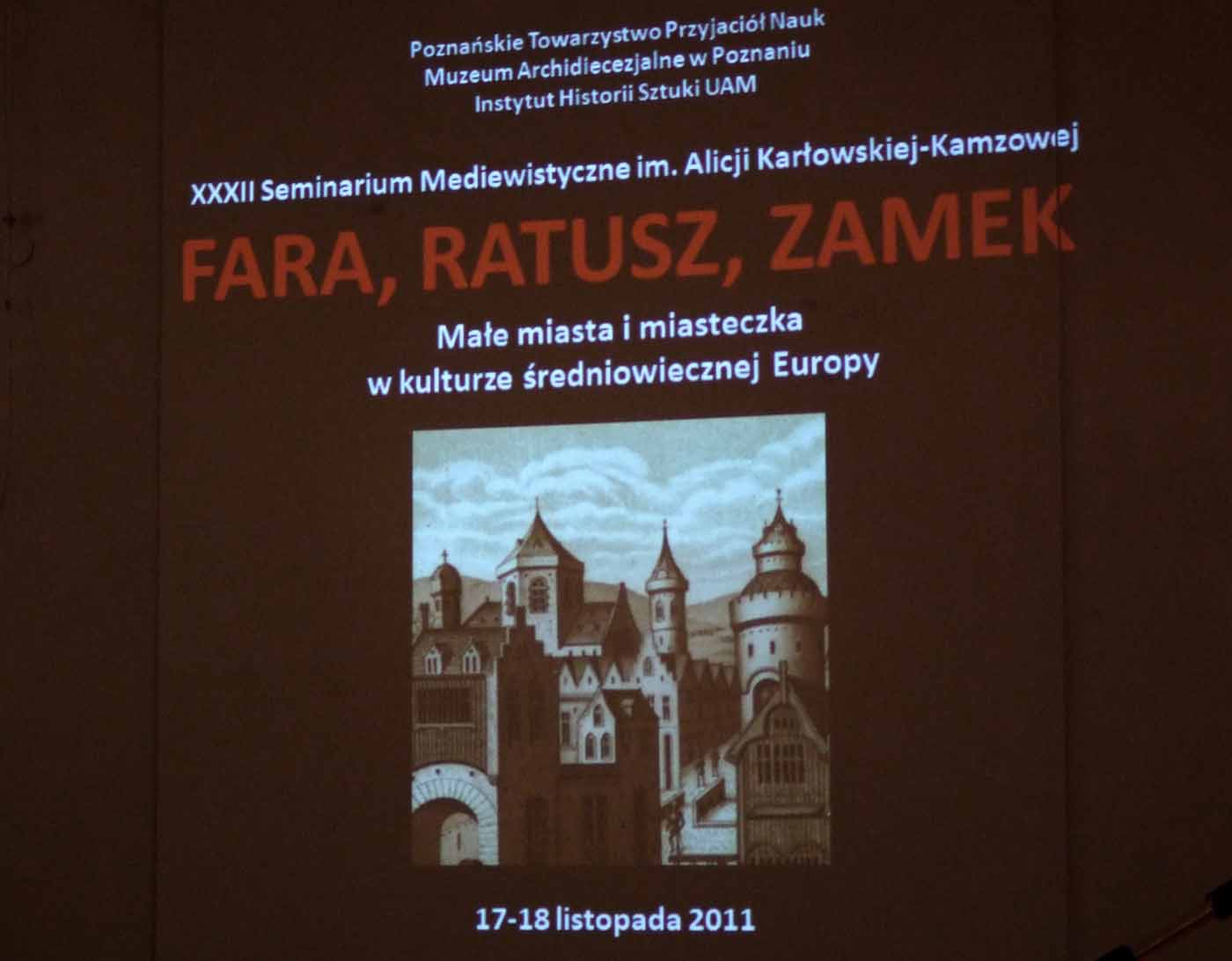W dniach 17-18 XI 2011  miały miejsce obrady XXXII Seminarium Mediewistycznego im. prof. Alicji Karłowskiej-Kamzowej w Poznaniu, pt. „Fara – ratusz – zamek. Małe miasta i miasteczka średniowiecznej Europy„.